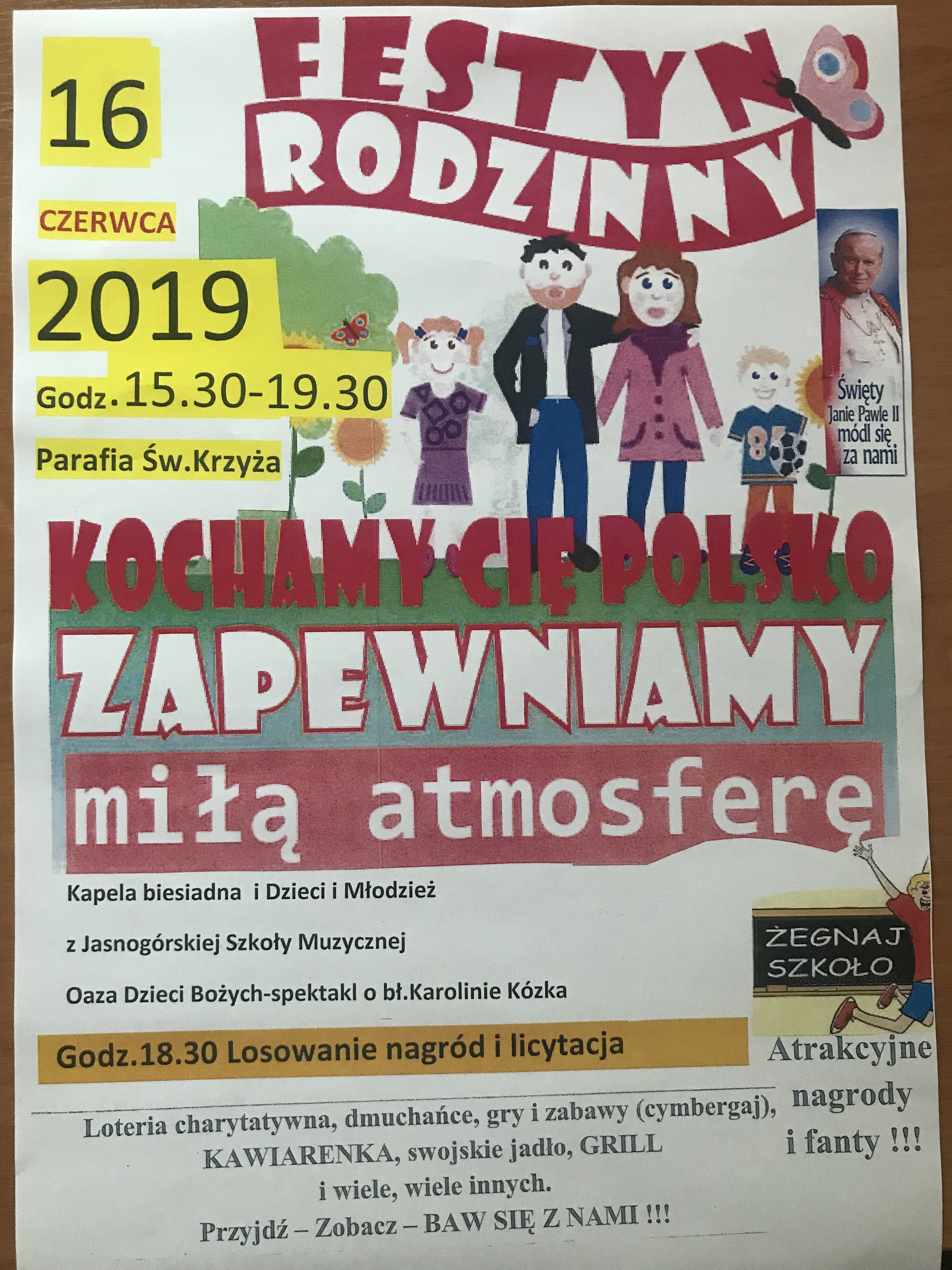 No, cóż. Była okazja aby dołożyć sobie kilka kilogramów. Pyszne ciasta – wypieczone przez nasze kochane parafianki. Tłuściutka kiełbaska i kaszanka grillowana przez naszych Rycerzy Kolumba. Aby nasze żołądki lepiej trawiły, nasz nie zastąpiony Krzysztof Witkowski – Prezes Muzeum Monet i Medali Jana Pawła II w Częstochowie, przygrywał nam na biesiadną nutę. Były konkursy z nagrodami oraz wspaniała rodzinna atmosfera. Za pieniądze uzyskane z festynu nasze dzieci i młodzież mogły spędzić wakacje z Bogiem. Wspólnie daliśmy radość tym najmniejszym. Najważniejsze jest jednak to, że poprzez naszą wspólną zabawę jako chrześcijanie uwielbialiśmy naszego Ojca w niebie. Niech błogosławieństwo i potrzebne łaski spłyną na wszystkich sponsorów i osoby zaangażowane w organizację tego przedsięwzięcia, a przede wszystkim na tych, bez których piknik nie odbyłby się, czyli naszych kochanych parafian.