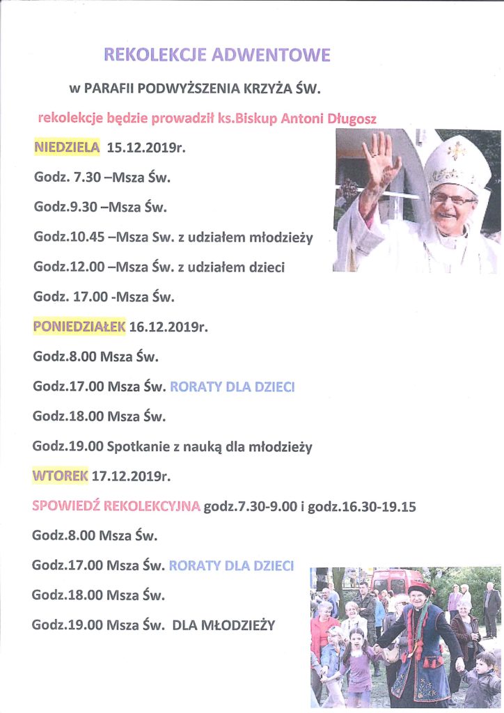 REKOLEKCJE ADWENTOWE – ZMIANA TERMINU 5 grudnia 2019 by Parafia Ze względu na wyjazd Księdza Biskupa rekolekcje adwentowe odbędą się w innym niż wcześniej planowanym terminie. Ze względu na zaistniałe okoliczności przepraszamy i zapraszamy od 15 - 17 Grudnia 2019 roku.