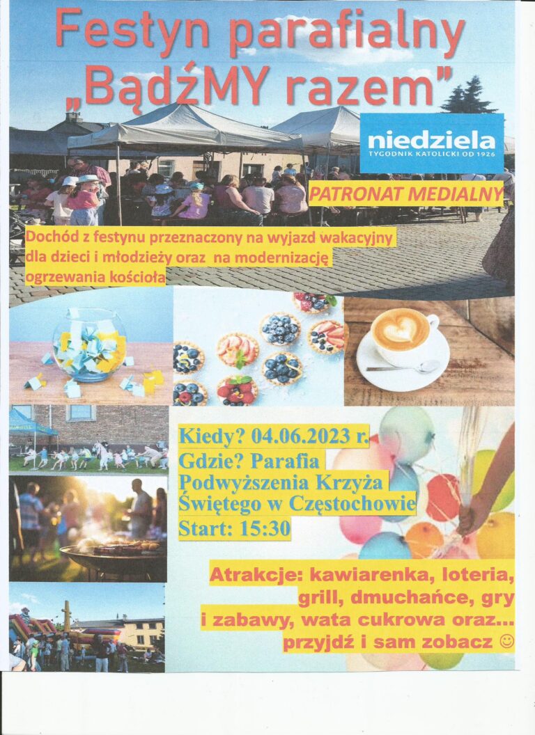 Pragniemy poinformować naszych drogich parafian o rozpoczętych pracach na rzecz festynu rodzinnego, który co roku organizujemy na terenie naszej parafii. W tym roku wydarzenie to odbędzie się w niedzielę 4 czerwca w godzinach od 15.30 do 19.30. Naszej imprezie przyświecać będzie hasło „BĄDŹMY RAZEM”. W związku z tym zwracamy się do Państwa o pomoc w organizacji tego przedsięwzięcia. Czekamy na Wasze pomysły i sugestie, które pomogą nam uatrakcyjnić wspólną zabawę. Jak co roku organizujemy zbiórkę fantów na festyn. Mogą to być nietrafione prezenty, które zalegają w naszych domach, a podarowane przez Was mogą dać radość innym. W tym roku środki uzyskane z festynu zostaną przeznaczone na wakacyjny wyjazd dzieci i młodzieży z naszej parafii oraz na modernizację ogrzewania naszej świątyni. Kolejne, drugie już z kolei zebranie organizacyjne festynu odbędzie się już 8 maja po wieczornej mszy św. ok. godz. 18.30 na, które serdecznie zapraszamy. Bądźmy żywym Kościołem.